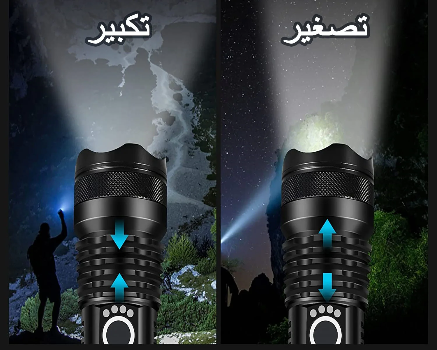 ✔️ يتميز بخاصية التكبير التلسكوبي (zoom) عن طريق تدوير رأس أو عدسة المصباح اليدوي.